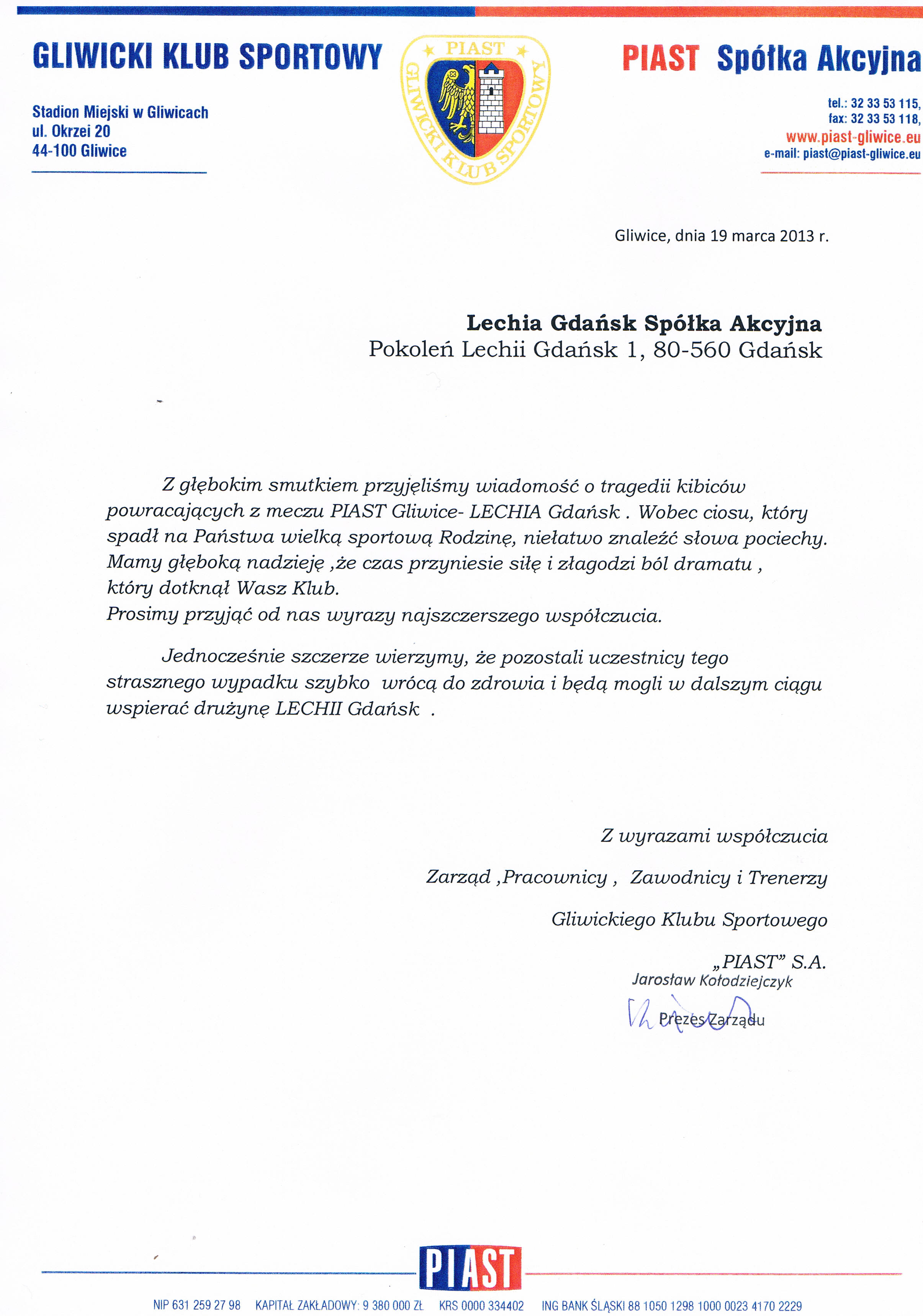 Ze smutkiem przyjęliśmy informacje, o wypadku autobusu wiozącego kibiców gdańskiej Lechii z Gliwic.Przygnębieni tą informacją ,pragniemy złożyć, najszczersze wyrazy głębokiego współczucia i smutku rodzinom i bliskim tragicznie zmarłych kibiców. Łączymy się z nimi i naszymi przyjaciółmi z Przymorza w modlitwie.