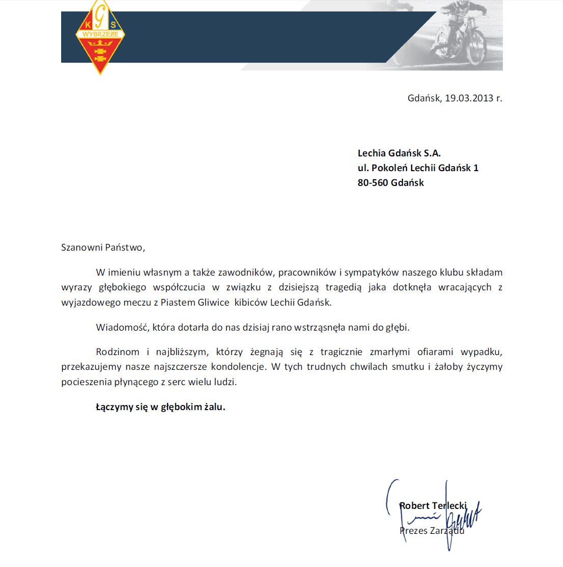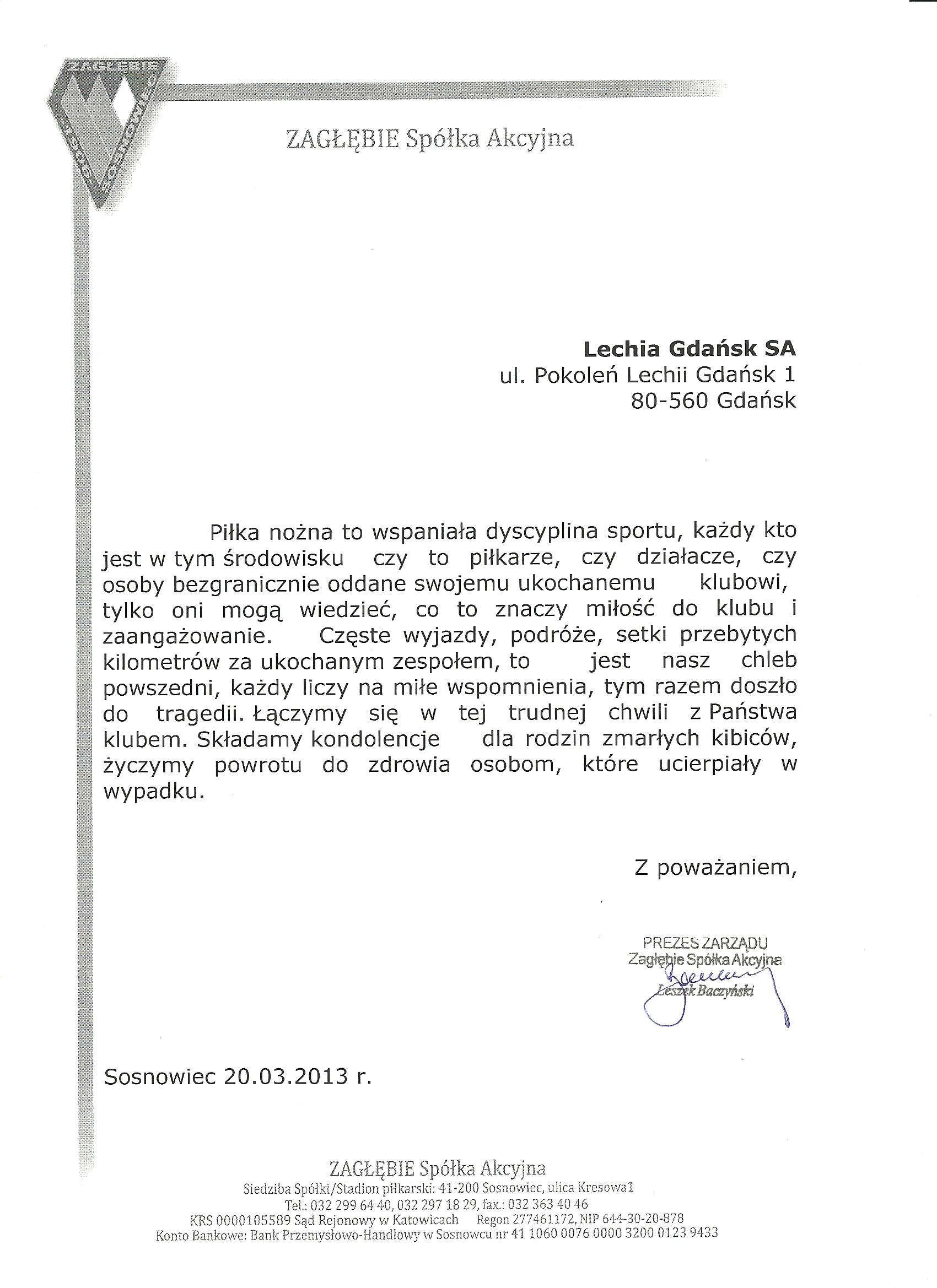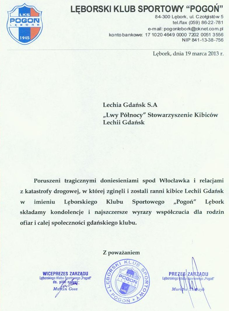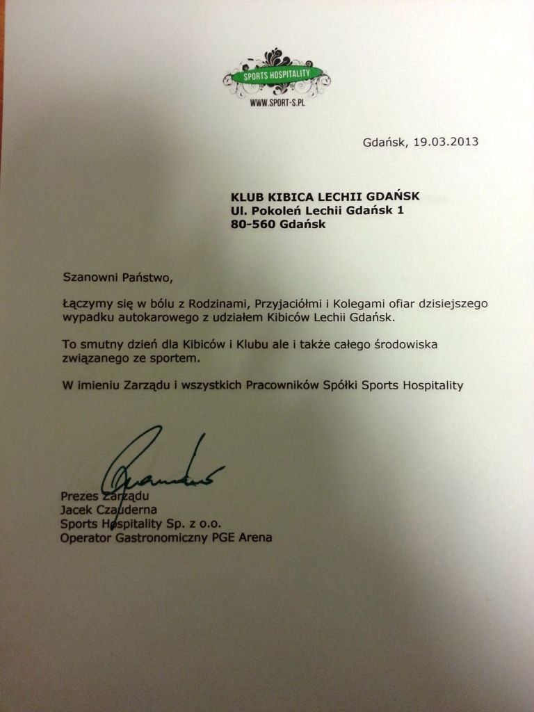 Jako kibice doskonale potrafimy wczuć się w nastroje, które obecnie dominują wśród gdańszczan i ze względu na powagę sytuacji animozje pozostawiamy z dala. W imieniu wszystkich kibiców Widzewa Łódź pragniemy złożyć na ręce STOWARZYSZENIA KIBICÓW LECHII GDAŃSK „LWY PÓŁNOCY” najszczersze wyrazy ubolewania i współczucia w związku z tymi tragicznymi wydarzeniami. Lechiści, dziś Widzewiacy łączą się z Wami w smutku i wspólnie opłakują Waszych nieodżałowanych kolegów. Stowarzyszenie „Fanatycy Widzewa”