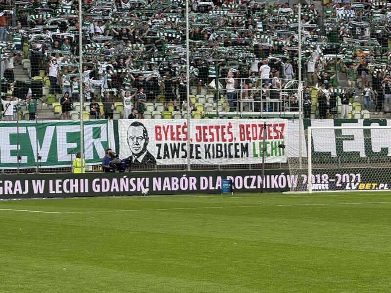 Karol Nawrocki pojawił się na trybunach Polsat Plus Areny Gdańsk. Przed 19.00 pojawił się pod stadionem. Kibice wywiesili zaś transparent dla prezydenta.