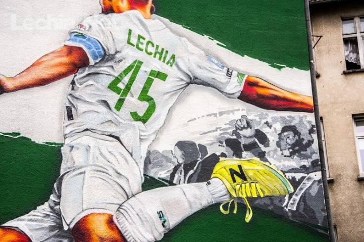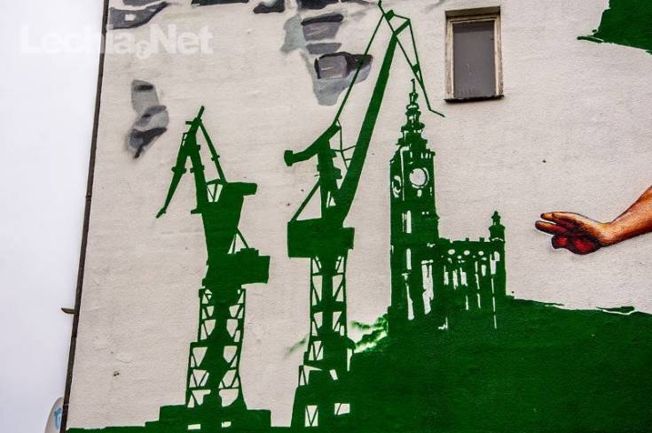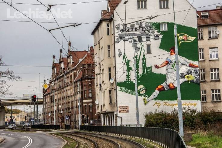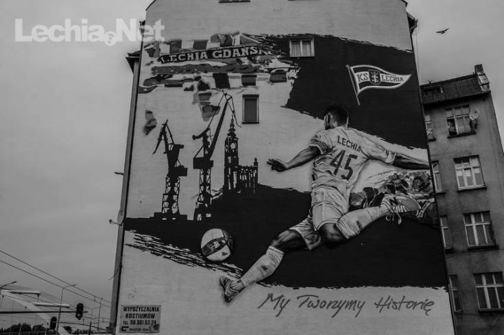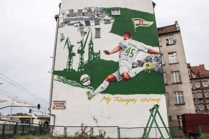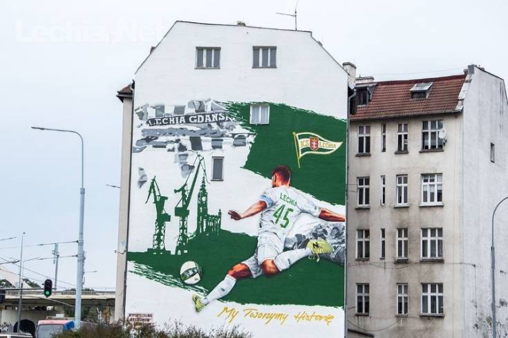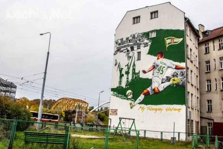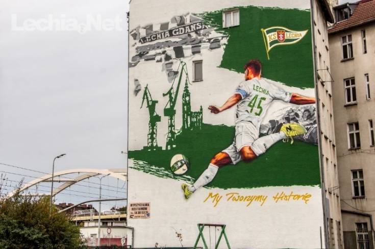 Mural znajdujący się w niedalekim sąsiedztwie Europejskiego Centrum Solidarności oraz Stoczni Gdańskiej przedstawia zawodnika z numerem "45" na koszulce, kopiącego piłkę w kierunku symboli miasta, a więc Ratusza Głównego Miasta i stoczniowych dźwigów, a także kibiców Lechii Gdańsk. Praca ma wymiary 13 na 19 metrów i została uwieńczona hasłem "My Tworzymy Historię" w kolorze złotym. Z pewnością mural stanie się ważnym miejscem na biało-zielonej mapie Gdańska.